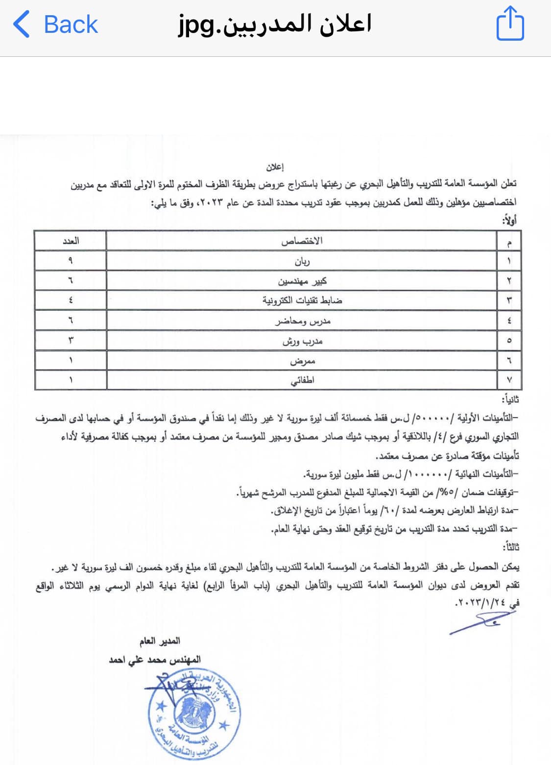 تعلن المؤسسة العامة للتدريب والتأهيل البحري في اللاذقية عن استدراج عروض للتعاقد مع مدربين مختصين لعام 2023، بطريقة الظرف المختوم للمرة الأولى، علماً أن آخر مهلة للتقديم نهاية الدوام الرسمي يوم 24/1/2023م.