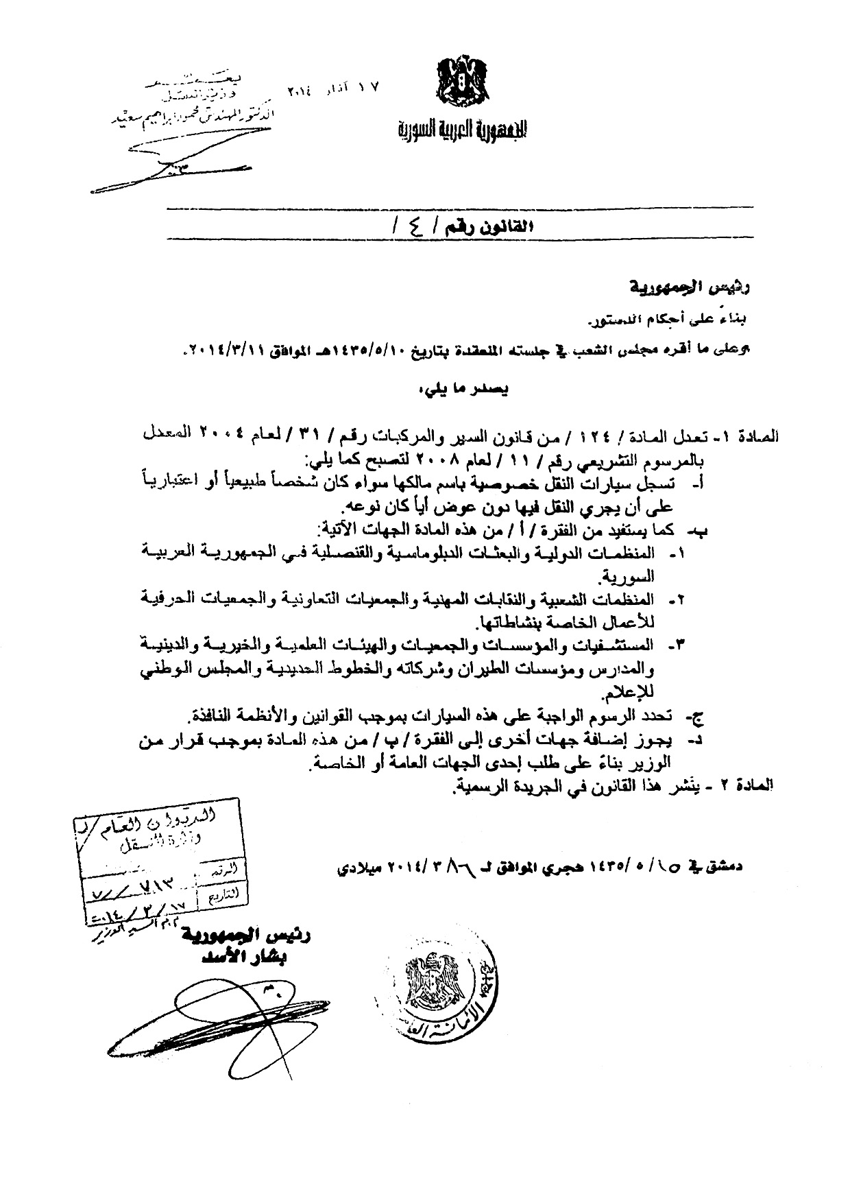 كما تم تعديل المادة /124/ منه بصدور القانون رقم (4) لعام 2014 ، والمتعلقة بتسجيل سيارات النقل الخصوصية.